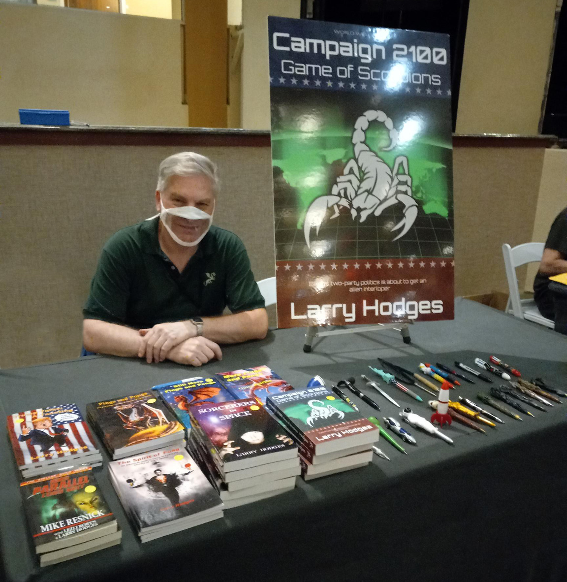 I spent much of the weekend jumping back and forth between coaching at MDTTC and the Capclave SF Convention, held in Rockville, MD, 25 minutes away. I was on three panels (moderating one), did a reading, and had a two-hour author signing session (along with others). Here's a picture of me at the signing! I have eight SF books, including The Spirit of Pong, which is both SF and TT. I have nine books on table tennis - here's all my books. One interesting note - my "secret identity" is really getting out - SF fans and writers keep coming up to me to ask about or mention table tennis! (In the picture, that's my science fiction & fantasy pen collection on display.)